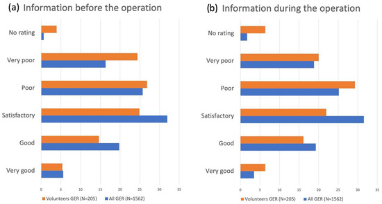 Figure 4), the commonest appraisal was “satisfied” (volunteers: 33%; all: 42%), followed by “dissatisfied” (volunteers: 25%; all: 24%) and “very dissatisfied” (volunteers: 12%; all: 6%). Neither satisfied nor unsatisfied are in a similar range as dissatisfied persons (volunteers: 24%; all: 24%). The “no rating” category was selected by a few respondents (volunteers: 2%; all: 1%). The chi-squared test result was
