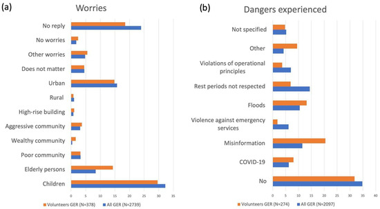 Figure 8), the majority reported none (volunteers: 32%; all: 35%), followed by reports on misinformation (volunteers: 20%; all: 11%). The floods themselves were reported (volunteers: 13%; all: 10%), rest periods not respected (volunteers: 7%; all: 14%), and COVID-19 affected some (volunteers: 8%; all: 6%). The chi-squared test result was