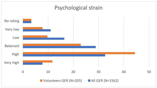 Figure 9), the majority reported it as high (volunteers: 44%; all: 33%), followed by “balanced” (volunteers: 23%; all: 29%). The psychological strain was very high for some (volunteers: 12%; all: 8%), low for others (volunteers: 10%; all: 16%), or “very low” (volunteers: 8%; all: 11%). The “no rating” category was selected by a few respondents (volunteers: 3%; all: 3%). The chi-squared test result was