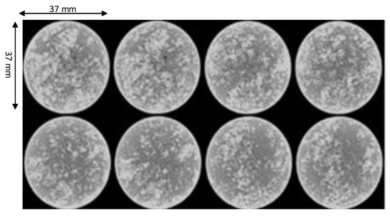 The rock cores investigated in this research were obtained from a single carbonate–dolomite formation in Iran. It dates back to the Triassic period, and is composed of a 178 m depth of limestone intercalated with dolomites, containing vast reserves of natural gas [49,50]. Using the information available from geological reports, macroscopic and microscopic (e.g., thin section) feature studies, and core analysis, this carbonate–dolomite formation was sub-categorized into eight distinct GUs. The identified lithology of each GU is presented in Section 3, along with the physicomechanical properties of the intact samples. One core from each of the eight GUs was selected for detailed investigation in this research. Before performing the UCS, BTS, and HTS testing, all test specimens were proven intact, as determined from X-ray computed tomography image analysis (see Figure 1). Their petrophysical characteristics and mechanical properties were determined using standard laboratory rock mechanics tests. The specific gravity (rock matrix density) was measured using the gas pycnometer method according to ASTM D5550 [51], quantifying the amount of empty spaces inside the rock samples, thereby allowing for the specific gravity calculation based on the mass and volume of the solid constituents. The rock porosity was measured using mercury intrusion porosimetry in accordance with ASTM D4404 [52], with the bulk density measured in accordance with ASTM D1188 [53]. The velocities of compressional (P-wave) and shear (S-wave) waves (i.e., VP and VS, respectively) were measured using ultrasonic testing performed in accordance with the ISRM standard. Following the guidelines set by ISRM, numerous rock test specimens were created for performing the UCS, BTS, and FT testing. For the UCS determination, cylindrical test specimens were subjected to axial compression loading using uniaxial testing equipment, with the UCS value calculated as the highest mobilized axial load (at failure) divided by the test specimen’s original cross-sectional area. The value of Young’s modulus (E) was determined via analyzing the initial (linear) portion of the obtained axial stress–strain curve, while the value of Poisson’s ratio (v) was obtained via evaluating the ratio of the measured lateral to axial specimen strains. The BTS and FT measurements were also obtained in accordance with the ISRM testing standard. For the FT, test specimens prepared with predetermined notches experienced crack propagation as the loading was increased. Related data, including applied load and crack length, were carefully recorded, and used to calculate the critical stress intensity factor, providing a numerical representation of the rock’s resistance to crack propagation (i.e., its FT). The values of apparent cohesion (C) and internal friction angle (φ) were determined from the results of a series of triaxial compression tests performed on cylindrical rock specimens.