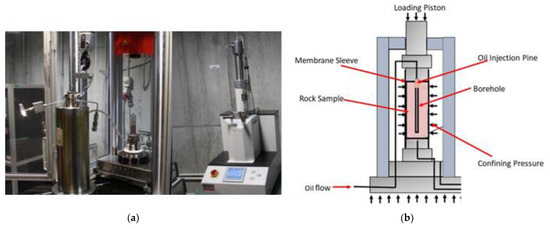 Laboratory test apparatus for performing the hydraulic fracture experiments: (a) apparatus photograph; (b) schematic view of the test specimen set up in the triaxial cell.