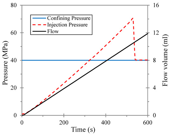 Injection pressure mobilization during hydraulic fracture test for 40 MPa confinement pressure and an oil injection rate of 1.2 mL/min to the specimen’s bore cavity.