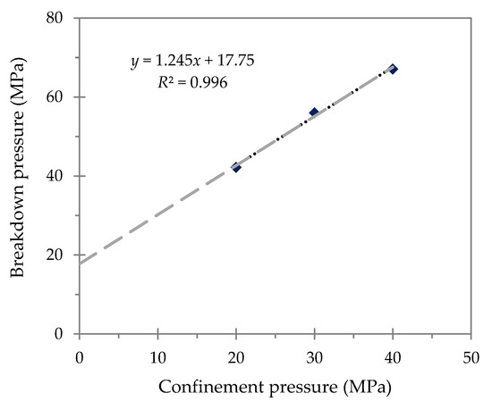 Table 2 and Table 3 list the respective petrophysical characteristics and mechanical properties of the eight GUs comprising the carbonate–dolomite rock formation. Note, the experimental values of UCS and BTS measured for the eight GUs ranged from 29.7 to 162.2 and from 1.93 to 12.23 MPa, respectively. Table 4 presents the hydraulic fracture test results, with the HTS values determined as follows. For each GU, the measured breakdown pressures for the three tested specimens (A–C) were plotted against their corresponding applied confinement pressures, from which the best fitting linear correlation was obtained, with the y-axis intercept value defined as the HTS [29,31]. As an example, Figure 5 presents the best fitting breakdown pressure–confinement pressure correlation, deduced from the data obtained for the geomechanical unit GU5, with the associated value of HTS determined as 17.75 MPa. Note, the experimental values of HTS measured for the eight GUs ranged from 7.20 to 20.63 MPa.