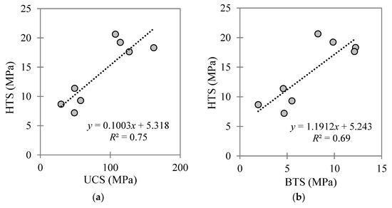 - UCS, BTS, E, ρ, VP, and VS directly correlated with the HTS, whereas the rock porosity was found to inversely correlate with the HTS. The correlations between the HTS and the UCS, BTS, and E produced the best agreements.