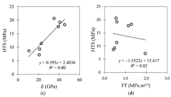Correlations between the HTS and (a) UCS, (b) BTS, (c) Young’s modulus, and (d) FT for the investigated carbonate–dolomite formation, comprising eight distinct GUs.
