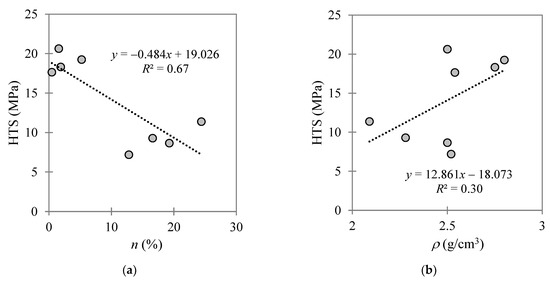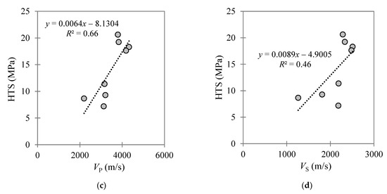 Figure 6 presents various correlations deduced between the measured HTS and the UCS, BTS, Young’s modulus, and FT parameters for the eight carbonate GUs investigated. Furthermore, Figure 7 presents the correlations deduced between the HTS and the rocks’ physical properties of porosity, bulk density, VP, and VS.