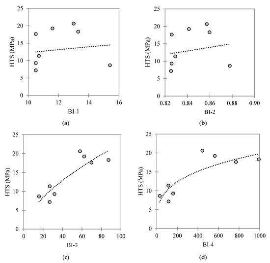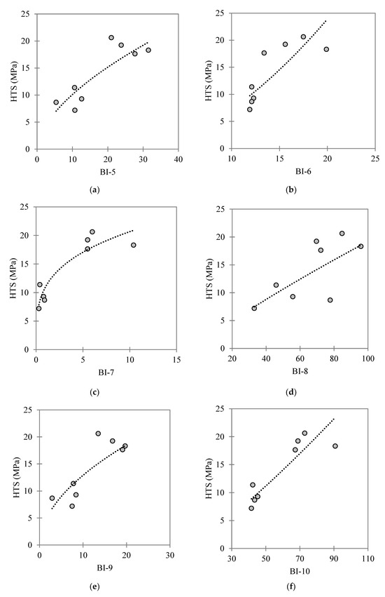 This section investigates the strength of the correlations between the ten existing strength-based BIs listed in Table 1 and the measured HTS for each of the eight GUs. Using the measured UCS, BTS, bulk density, unit weight, and/or Young’s modulus values as inputs, the values of the ten BI parameters were calculated for each GU using Equations (1)–(10), as listed in Table 6.