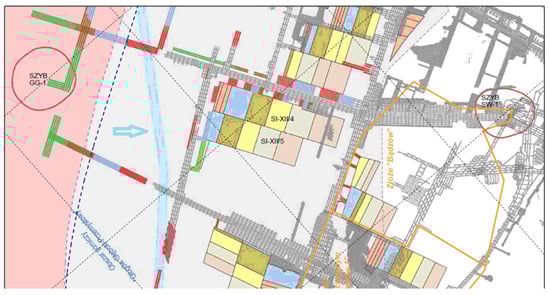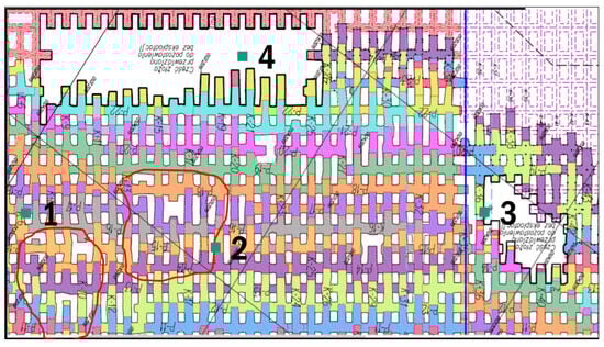 Sketch of the selected fragments of the fields, together with the progress of the individual excavation. White parts of the map signed in Polish mean parts of the mining field excluded from excavation. The colors represent the following months of excavation. The dotted lines symbolize the planned excavation of with room and pillar system.