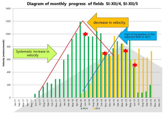 The diagram (Figure 4) shows the distribution of the velocity of the excavations in each month in the SI-XII/4 and SI-XII/5 fields since the beginning of the operation. The green color indicates the velocity of SI field XII/4 in each month, while the orange color indicates the velocity of SI field XII/5. From June 2017 to May 2018, a systematic increase in the velocity in the SI-XII/4 field can be observed. In May 2018, the branch started the excavation of the adjacent field SI-XII/5. As the progress in this field increases, a decrease in velocity in the SI-XII/4 field can be observed. The chart shows the previously discussed moments of escalation of gas and the outburst hazard. It is now clear that they are not only related to the local velocity drops but also that they fit into the slowing down trends across the fields. The greatest total velocity in the SI-XII/4 field took place in May 2018 and amounted to approx. 1200 running m.