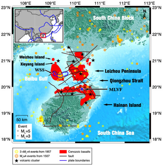 - Wei, F.; Wei, W.; Yu, H. The Cenozoic volcanic fields in northern Hainan Island and Leizhou Peninsula, South China: Eruption history, magma source and dynamic background. Geol. Soc. Lond. Spec. Publ. 2020, 510, 179–196. [Google Scholar] [CrossRef]