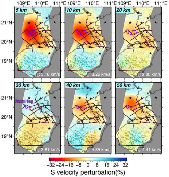 - Lin, J.; Xia, S.; Wang, X.; Zhao, D.; Wang, D. Seismogenic crustal structure affected by the Hainan mantle plume. Gondwana Res. 2022, 103, 23–36. [Google Scholar] [CrossRef]