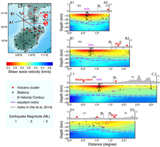 - Jia, S.; Li, Z.; Xu, Z.; Shen, F.; Zhao, W.; Yang, Z.; Yang, J.; Lei, W. Crustal structure features of the Leiqiong depression in Hainan Province. Chin. J. Geophys.-Chin. Ed. 2006, 49, 1385–1394. [Google Scholar] [CrossRef]