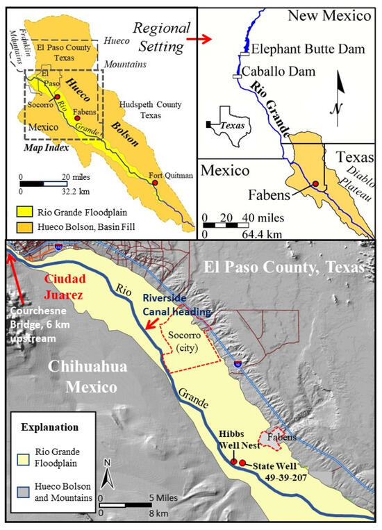 The study focuses on the Rio Grande Aquifer within the “El Paso-Juárez Valley,” specifically where the Rio Grande flows across a broad alluvial floodplain (Figure 1, Figure 2 and Figure 3). The term “modern Rio Grande floodplain” refers to the current surface across which the Rio Grande flows, while floodplains formed by ancestral versions of the Rio Grande are now part of the regional Hueco Bolson Aquifer (orange area of Figure 1). The Rio Grande alluvium, consisting of basal-channel floodplain deposits of late Quaternary (~15 ka to modern) age, averages about 65 to 85 feet (20–26 m) in thickness (Hawley, written communication, 2021 [45]). The Rio Grande Aquifer has been variably described as 150 to 250 feet (46–76 m) thick due to challenges in distinguishing it from similar deposits of the Ancestral Rio Grande of Early Pleistocene age [38,46].