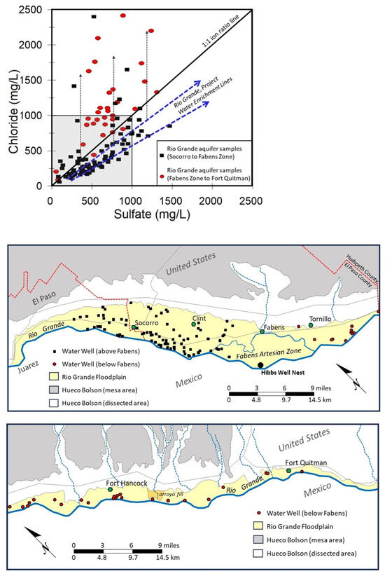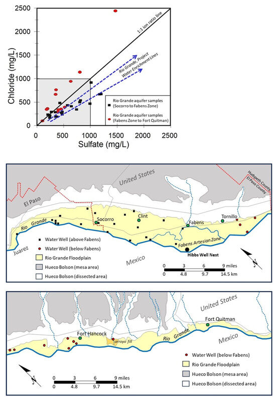 Historic data collected from the Rio Grande Aquifer in the study area from 1960 to 1975 are plotted (Figure 3), with samples distinguished by location: upstream of Fabens (Socorro to the Fabens Artesian Zone), or downstream of Fabens (the Fabens Artesian Zone to Fort Quitman). The Artesian Zone where salinity infusion occurs between Fabens and Tornillo is omitted in order to emphasize the distinction between the upstream and downstream zones; it shows comingled characteristics of both zones. The data were mostly collected from irrigation wells screened within the interval 20 to 200 feet (6.1 to 60.1 m) BGS, with most screens between 20 and 100 feet (6.1 to 33.2 m) BGS. Above the Fabens Artesian Zone, most of these data follow the sulfate vs. chloride enrichment lines of Merino (2006) and Szynkiewicz et al. (2015) [40,58] for which sulfate is the dominant anion by weight. Note, however, that a few samples plot on or above the 1:1 weight ratio line (Figure 3). From the Fabens Artesian Zone to Fort Quitman, chloride becomes the dominant anion by weight in many samples. The shift in Cl/SO4 weight ratios occurs mainly below the Fabens Artesian Zone and is accompanied by a general increase in salinity. About half of the samples below the Fabens Artesian Zone contain chloride or sulfate concentrations above 1000 mg/L, whereas almost all of the samples above the Fabens Artesian Zone have concentrations of less than 1000 mg/L for each anion. The change near the Fabens Artesian Zone coincides spatially with the appearance of saline artesian water in the Rio Grande Aquifer [41] (Figure 2).