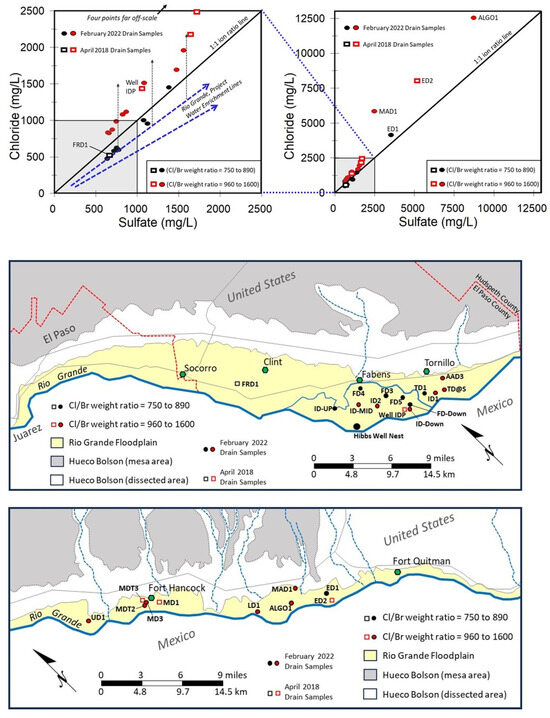 Sampling results for the Rio Grande Aquifer, April 2018 and February 2022, focusing on the artesian area around Fabens and Tornillo, and extending into Hudspeth County. The majority of samples were collected from drains, except for Well IDP, a large-diameter well casing reaching a depth of 50 ft (15.2 m). Bromide was included in the analysis dataset to differentiate the halite dissolution signature from agricultural salinity. Halite dissolution sources were identified when Cl/Br weight ratios in water samples exceeded 950. Samples with lower Cl/Br ratios under 900 (represented by black dots) primarily aligned with or were close to the Rio Grande Project Water Enrichment lines (Figure 2). The samples with black dots exhibited concentrations below 1000 mg/L for Cl and SO4 and were located furthest from the Fabens Artesian Zone where Hibbs Well Nest is situated. Samples with Cl/Br weight ratios above 960 are generally plotted above the 1:1 Cl/SO4 weight ratio line, with concentrations usually exceeding 1000 mg/L for both Cl and SO4. Some drain samples in the lower part of Hudspeth County displayed extremely high salinity, with one sample reaching 12,546 mg/L Cl and 8744 mg/L SO4. Overall, these samples indicate higher salinity in groundwater samples than what was found in the 2003 dataset [57].
