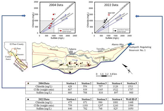 The spatial analysis of hydrochemical data collected from an agricultural drain reveals significant changes in water chemistry along the Island Drain (Figure 7). Described by Hibbs and Merino (2006) [41] and replicated in 2022, the Island Drain exhibits a notable increase in chloride concentration downstream in 2004 (428 mg/L to 1511 mg/L) and 2022 (475 mg/L to 1081 mg/L), with corresponding Cl/Br weight ratio increases from 807 to 1757 (2004) and 759 to 1243 (2022) (Figure 7). Sulfate concentration increases less markedly, from 660 to 960 mg/L (2004) and 640 to 825 mg/L (2022) between stations 1 and 5 and stations 1 and 4, respectively (Figure 7). Comparisons of data at Well IDP (2018) and station 5 (2004) reveal similar parameter concentrations. The saline groundwater identified at Hibbs Well Nest (Figure 1 and Figure 7) contributes to Island Drain salinity, emphasizing a crucial geological source of salinity loading between upstream and downstream samples. The increasing Cl/Br weight ratios confirm the geologic input of halite.