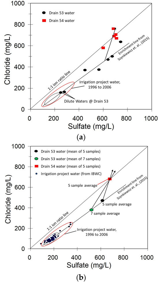 Data of Szynkiewicz et al. (2015) [40] at drain sites 53 and 54 are replotted on a chloride-sulfate scatter plot with identical scales for the x and y axes (Figure 8). Two dilute drain samples in upstream drain 53, referenced in this discussion as dilute waters @ drain 53 (DW @ drain 53), appear to be overflows of Rio Grande project water, because these samples contain a project water signature. Project water data are plotted alongside the Szynkiewicz et al. (2015) [40] data (Figure 8). Project water was collected over a 10-year period specifically during the irrigation season (Figure 8). DW @ drain 53 was plotted within the range of project water salinity, while all other drain samples are much more saline than project water. Three of the five remaining samples from drain 53 are of higher salinity, have a Cl/SO4 weight ratio ~0.85 and are plotted on a trend defined by project water and Rio Grande water enriched in solutes by evaporation (Figure 2, Figure 7, Figure 8 and Figure 9). Such drain water is probably fed by seeping groundwater that has the salinity observed in the Rio Grande Aquifer in the area above Fabens [58]. Drain 54 samples have Cl/SO4 weight ratios near 1.0, reflecting the addition of groundwater in which Cl concentrations exceed those of SO4 (Figure 7, Figure 8 and Figure 9).