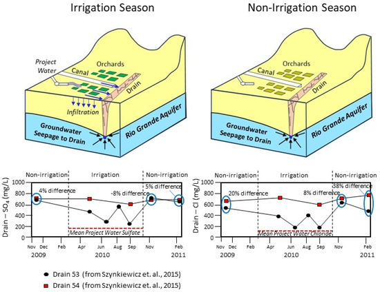 DW @ drain 53 is virtually raw project water (river water in Szynkiewicz et al., 2015) when compared with other isotopic and hydrochemical parameters presented by Szynkiewicz et al. (2015) [40]. Time series data from Szynkiewicz et al. (2015) [40] show greater input of chloride compared to sulfate at stations 53 and 54 during both irrigation and non-irrigation seasons (Figure 9). Return flows of project water from canals to drains cannot occur during the non-irrigation season (Figure 9). It is therefore more meaningful to look at the data during the non-irrigation season when the samples more likely represent groundwater baseflow signature only (Figure 9; November 2009, November 2010 and February 2011). Sulfate concentration is virtually unchanged at stations 53 and 54 when no irrigation is occurring, as labeled in Figure 9. Chloride goes up concurrently between stations 53 and 54 by 20%, 8%, and 38% in the non-irrigation samples (Figure 9). These findings present problems for the overall salinity model developed by Szynkiewicz et al. (2015) [40] that favors the enrichment of sulfate slightly over chloride in their enrichment trend line for Mesilla Valley and El Paso Valley (compare our Figure 2 and Figure 8).