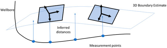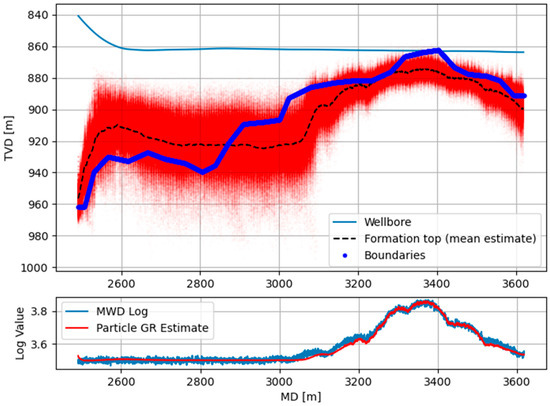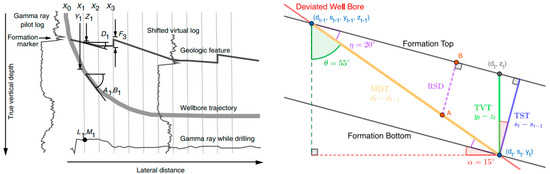 Similar to the work in [13,19], in this work a particle filter is used to address the well-log interpretation problem. The states of interest are inclination , azimuth , TVD , true stratigraphic thickness (TST) of the formation , and RSD between the logging tool and the upper formation layer of the logging tool at the station . The RSD is the distance between the wellbore and the formation boundary measured in the direction of the formation layer’s TST as shown earlier in Figure 1.