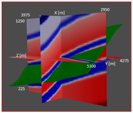 3D horizon estimate (green) plotted against orthogonal slices of the seismic velocity model (seismic color map).