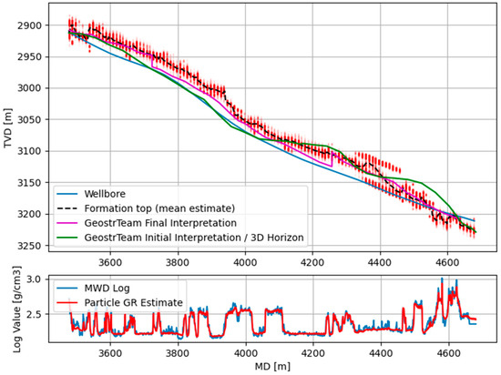 In well 15-9-F-15D, the particle filter is run at each log measurement point, and the results are plotted in Figure 13. It can be observed that the filter estimates closely match both the density log and the geosteering team’s interpretations. A similar comparison between the proposed approach and field results in well 15-9-F-1C is plotted in Figure A1 in the Appendix A.