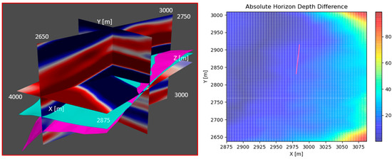 (Left): 3D horizon fitted through the boundary estimate (blue) plotted against 3D horizon from the Volve dataset (pink). (Right): Heatmap of absolute depth difference between horizon in dataset and horizon fitting result. Both results are for well 15-9-F-1C.