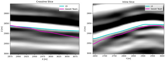 Comparison of seismic horizons on crossline (left) and inline (right) slices of seismic image volume. Both results are for well 15-9-F-15D.