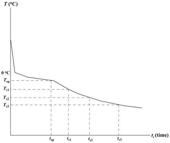 As mentioned above, only a part of the formation’s pore water changes to ice at 0 °C. The phase transition temperature interval exists in numerous laboratory and field experiments. With the subsequent lowering of the temperature, the water phase transition continues (Figure 1). The temperature interval of the phase transition mainly depends on the mineralogical composition of the geological formations. Let us assume that the water–ice phase transition is completed at the time tep, and at least three temperature logs are taken after refreezing thawed formations (Figure 1).