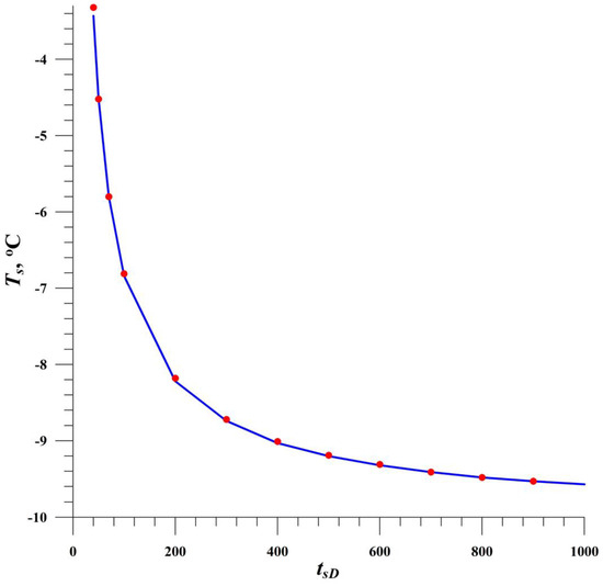 Transient shut-in temperature. Case 1, B = 3.39 °C, Tfcal = −10 °C, tdD = 100, tepD = 18.5. The solid line is constructed using Equation (1); points present the numerical modeling results.