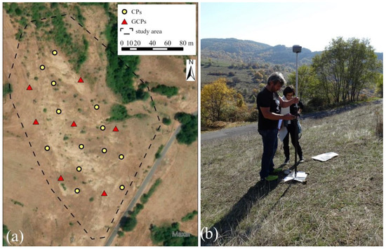 The georeferencing of the model required the establishment of 20 ground points, of which 7 were used as control points (GCPs) and 13 as check points (CPs). They were distributed over the area with a separation of about 20–30 m from each other (Figure 3). These points were marked with 20-cm wooden pegs hammered into the ground and a 30 × 30 cm black-and-white paper/plastic target, and subsequently measured via network RTK observations using a virtual reference station (VRS) correction service from the Bulgarian RTK Network “1 Yocto” (https://1yocto.bg/, accessed on 25 October 2021). A multi-system multi-frequency GNSS receiver CHCNAV i50, operated via Landstar, v. 7 field surveying software was used—all measurements were performed in fixed GNSS mode, with estimated RMS accuracies around 2 cm horizontally and 2.5 cm vertically. The results are given in Table 2.