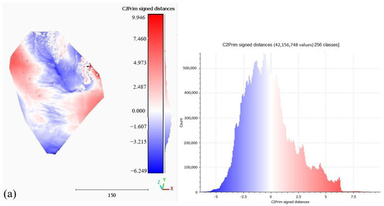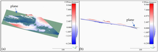 The three obtained point clouds of 45°—single strip, 60°—cross strips, and nadir—single strip geometry were processed with open-source software Cloud Compare, v. 2.13 beta [35]. They were compared with a flat plane and by a Multiscale Model to Model Cloud Comparison (M3C2) plug-in [25]. The clouds were filtered using a Cloth Simulation Filter (CSF) plug-in [36], with a cloth resolution of 0.1 and a Relief type of scene. This provided a useful approach to removing vegetation and artificial objects (e.g., electric poles). For the purpose of the comparison, a theoretical plane was automatically generated with reference to the 60° point cloud using the Fit Plane tool. The orientation of the fitted plane is a 16° dip angle at a 93° dip direction, centered in the middle of the Z values of the oblique 60° point cloud (613.925 m). For further processing (e.g., rasterization of the plane in ArcGIS Pro), it was subsampled into a flat 100 mln point cloud using the random method. The three point clouds were compared to the fitted plane using the Cloud/Primitive Distance tool, with the results stored in the relevant layer’s scalar field attribute (Figure 4). The method computes the exact distance from the cloud to the plane.