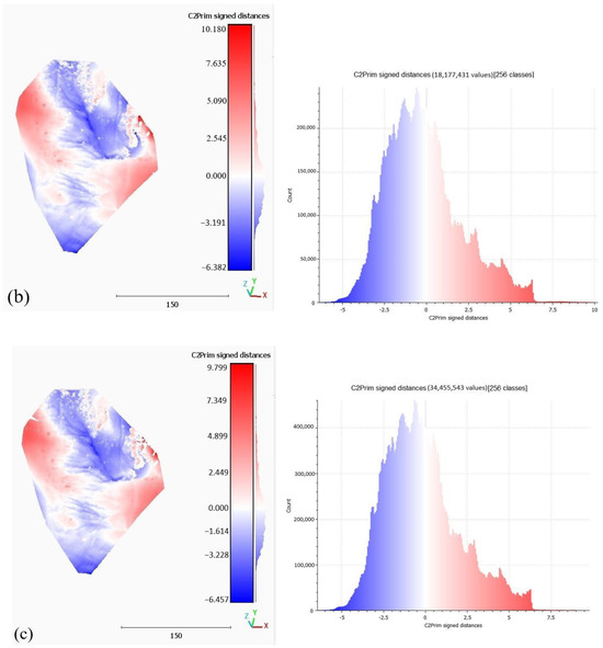 Cloud to primitive distances in meters: (a) cloud of oblique 60°—cross strips mode to plane; (b) cloud of oblique 45°—single strip mode to plane; (c) cloud of nadir—single strip mode to plane.