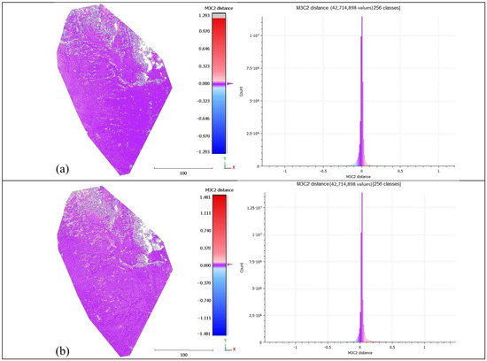 M3C2 distances in meters computed between the reference point cloud of 60°—cross strips mode and: (a) nadir—single strip cloud; (b) cloud of 45°—single strip mode.