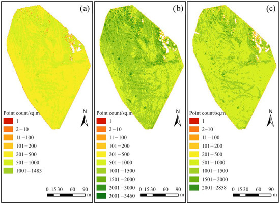 Spatial distribution of the points in the clouds: (a) oblique imagery 45°—single strip mode; (b) oblique imagery 60°—cross strips mode; (c) nadir viewing imagery—single strip mode.