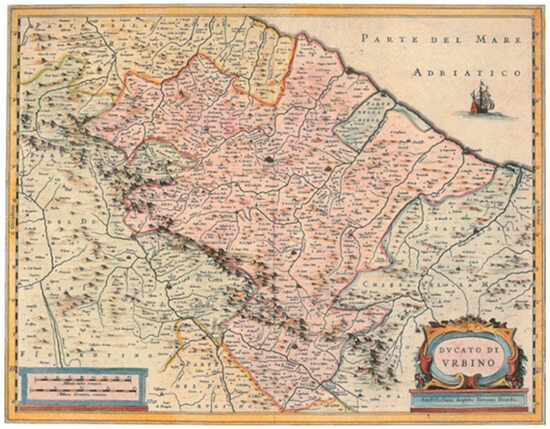 The Duchy of Urbino did not produce official maps [20]. However, this territory has numerous cartographic documents, one shown in Figure 1. The oldest is that of G.B. Clarici (c. 1570), which provided interesting indications of rivers, reliefs, and toponyms [3]. However, the geographical limits were not well defined, and in general, the boundary of the duchy had to be guessed due to inaccuracies in the drawing.