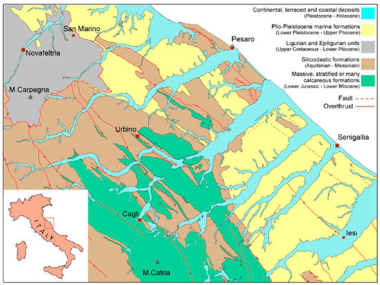 Simplified geological and structural sketch of the northern Umbro-Marchean Apennines (modified after Carta Geologica delle Marche, scala 1:250,000 [23]).