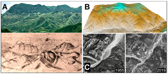 (A) Comparison between a drawing by Leonardo da Vinci (bottom) and the corresponding natural landscape (top). In both images, typical landscape shapes called flatirons (due to their characteristic pointed shape) can be recognized. (B) Remote sensing provides knowledge of the Earth’s surface. Valuable terrain models can be reconstructed through photos or numerical data gathered from planes, satellites, drones, and even geographic computing systems. (C) Analysis of diachronic aerial photos can highlight changes in the landscape over time. Left is an aerial photo from the mid-1900s; right is a 2019 image of the same area (map data © 2019 Google).