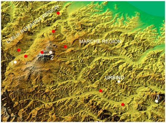 Observation points from which Piero della Francesca and Leonardo da Vinci “captured” the landscape for some of their paintings (red dots). The white dots indicate the observation points for the three artworks discussed in this article. 1 = Madonna Litta by Leonardo da Vinci; 2 = Nativity by Piero della Francesca; 3 = Knight’s Dream by Raphael.