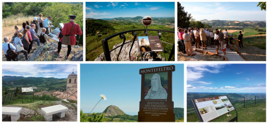 Thus, the Montefeltro Renaissance Views (MVR) project was born, under which itineraries were designed to retrace the journeys of Piero della Francesca, Leonardo da Vinci, Raphael Sanzio, and other great Renaissance artists. Visitors are accompanied by specialized guides along the routes that connect the places visited by the illustrious figures of the past, arriving at the sites from which the backgrounds for the works of these artists were captured. The guides have geology and geomorphology expertise and focus on the pictorial works representing the place. Thanks to the support of the Marche and the Emilia-Romagna regions, the project has developed new forms of cultural approach to create a new and alternative concept of “museum” for an integrated reading of the territory. These studies on the backgrounds in Renaissance paintings, moreover, have been in parallel with a prolonged activity aimed at the enhancement of geoheritage and the development of geotourism, both in the Marche Region and in the Marecchia Valley area [64,65,66,67].