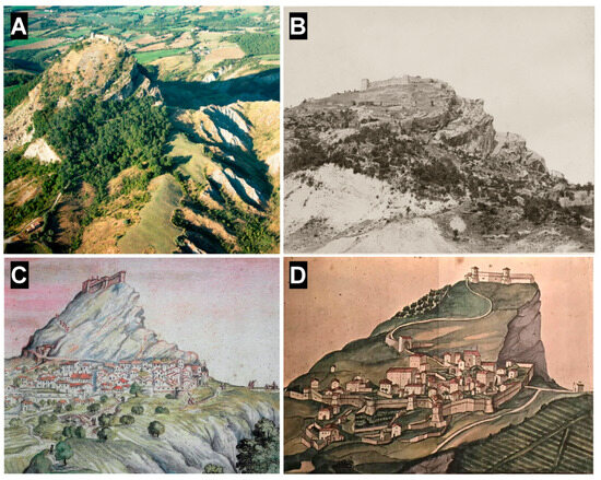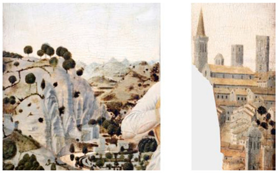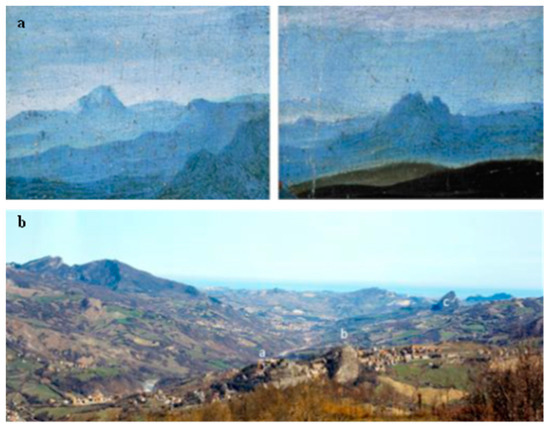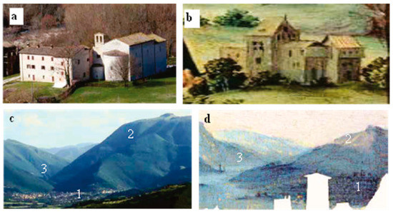 Figure 10 compares some details of today’s landscape and the painting. Mount San Paolo, Mount della Valle, Gemmano, Montefiore Conca, Mount Montone, and Montecopiolo are easily identified in the painting. It is worth dwelling on the depiction in the painting of Montecopiolo Castle, which is the place of origin of the Montefeltro family [71]. The high ground of Montecopiolo was already inhabited in prehistory and Roman times and was fortified in the 10th century. According to the castle’s traditions, the dukes of Urbino, the Montefeltro, originated there. In 1140, the castrum montis cupioli was, in fact, assigned to Antonio da Carpegna, who was considered the founder of the Montefeltro family. In 1448, the castle resisted the assaults of Sigismondo Malatesta and, in 1502, was used by Duke Guidobaldo as a refuge during the occupation of the duchy by Valentino (Cesare Borgia). In 1552, it was put under siege by the troops of Giovanni de’ Medici: the castle suffered some damage but was not destroyed. It was then gradually abandoned during the 18th century [73].
