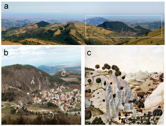 (a) Panoramic view from Mount Carpegna. In the white box, we can see Mount Montone and, at its feet, the village of Villagrande. On the right is Montecopiolo, with the famous ruined castle, the place of origin of the Montefeltro family; (b,c) Comparison between today’s landscape and the painting. A—Mount Montone; B—the village of Villagrande; C—Montecopiolo.