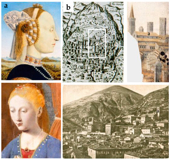 (a) Comparison between the Virgin Mary in the Nativity (bottom) and Battista Sforza in the Diptych of the Dukes (top); (b) The great medieval church (in the white frame, indicated by the letter a) painted by Piero is the city’s cathedral, dedicated to Saints Mariano and Giacomo, built between 1190 and 1229. Right next to the cathedral, in 1470, Federico began to build his ducal palace, also called Cortenuovo, trusting the work to Francesco di Giorgio Martini.