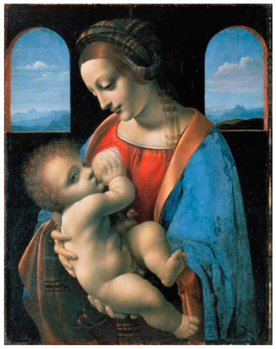 Some new landscapes in Leonardo’s paintings have recently been identified in this area by our working group and are being analyzed. This section considers the landscape that Leonardo da Vinci placed in the background of the “Madonna Litta”, a tempera painting on panel, 42 × 33 cm, exhibited at the Hermitage Museum in St. Petersburg (Figure 12).