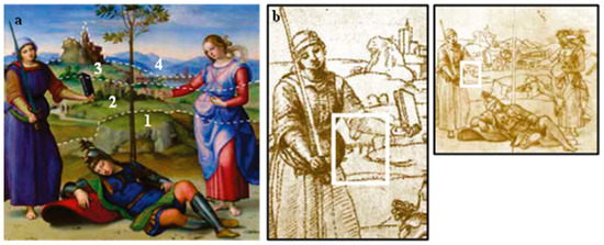 Raphael’s perception of landscape is significantly different. It can be said that with Raphael, the landscape, although real and recognizable, partly ceases to be a topographic and/or scientific representation of a place. Raphael’s landscapes speak of nature and beauty; they leak with love for their land, revealing ties and memories. The attachment to his land was truly strong as, indeed, still happens today to those who are born and grow up in this place. Although the life and works of Raphael, in their artistic, historical, and human aspects, have been rigorously examined by scholars from all over the world, there has not yet been a thorough study of the landscape. The natural environment in Raphael’s paintings, in fact, is described only from an aesthetic and symbolic point of view [18]. The reproduction of the places of his native land undergoes a mental metamorphosis, a perceptive interpretation of natural forms that nevertheless retain their morphological rigor and are, therefore, perfectly recognizable in the current landscape.