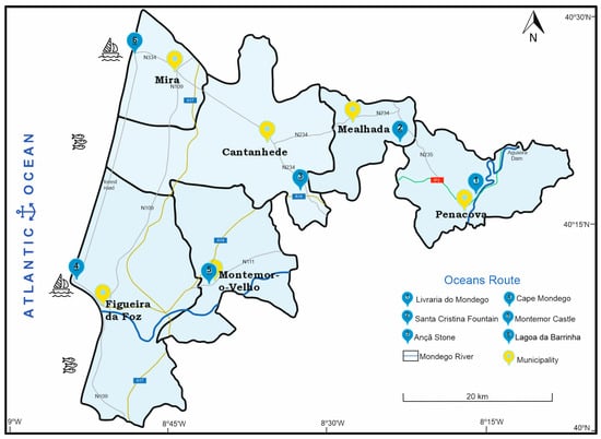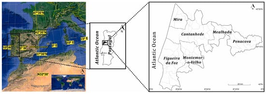 The research area is in the central coastal and rural regions of Portugal, encompassing six distinct municipalities (Cantanhede, Figueira da Foz, Mealhada, Mira, Montemor-o-Velho, and Penacova). The area sums up to 1452 km2 and 60 km of the coastal line (from Mira to Figueira da Foz; Figure 1). This region is located half-way from both the capital of Portugal, Lisbon, and Oporto, making it very accessible to visitation with already several infrastructures built: a railway, a highway, and a seaport. In terms of demographic characterization, this territory, in 2021, had 162,686 residents [], which makes a population density of 112 inhabitants/km2.