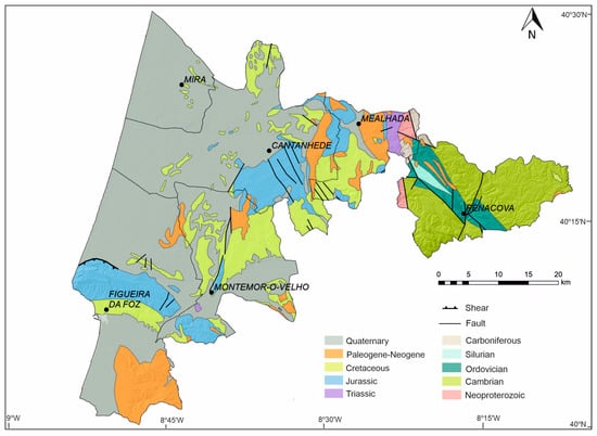 Geological map of the “Atlantic Geopark” Project territory (Original scale 1:500,000; project system: Datum Lisboa/Hayfor-Gauss EPSG: 5018; adapted from []).
