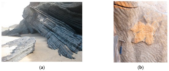 Starting from Cape Mondego north (Middle Jurassic), the record shows a monotonous sedimentation where the ammonites were thriving in that environment. This rich record, along with other biostratigraphic tools, allowed the experts to establish the Global Standard Stratotype and Point (GSSP) for the Aalenian–Bajocian boundary []. The second-best outcrop for the Bajocian—Bathonian age (ASSP—Auxiliary Standard Stratotype and Point) is also in Cape Mondego []. This outcrop is commonly known for its morphology as a “Porta-aviões” (“aircraft carrier”), especially by local fishermen.