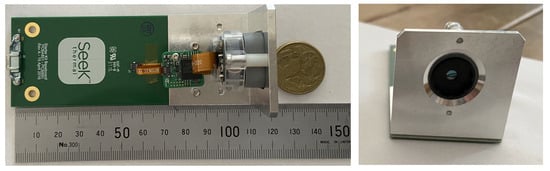 The theoretical and practical aspects of uncooled bolometers and their measurement capabilities are described in []. In the last few years, these systems have achieved accuracies that are acceptable for environmental studies of plumes and clouds; the main advantage of uncooled detectors compared to cooled detectors is cost. Uncooled TIR cameras have also become commercially available in highly portable, lightweight formats. The camera core has a fixed focus lens with a 56°× 42° field of view and a nominal NET of 100 mK at 300 K. The camera is controlled by a Raspberry pi-4 microcomputer https://www.raspberrypi.org, (accessed on 14 March 2024), and a visible camera is included in the package with a similar field of view as the IR camera. The camera (or earlier versions) has been used in applications to volcanic plumes [,] and in synergistic applications with other instruments, e.g., [,]. The IIRc system consists of a 320 × 240 microbolometer detector array (manufactured by SEEK Thermal, https://www.thermal.com/ (accessed on 14 March 2024)),mounted on an aluminium bracket and with a USB connection that provides power and signal communication. The specifications of the camera are provided in Table 1 and a photograph of the basic infrared component is shown in Figure 1.