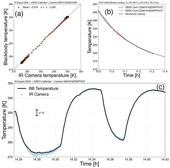 Calibration plots for two different IIRc systems. (a) blackbody vs. camera temperature, (b) cooling curve compared to theoretical Newtonian cooling, (c) rapid recycling of the blackbody temperature showing degree of correspondence with the IIRc-recorded temperatures.