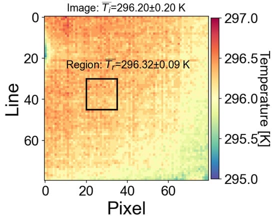In order to ensure uniformity of the blackbody plate, it needed to be small (0.04 m × 0.04 m), and, to avoid radiation from the plate heating the camera assembly, it was necessary to mount the camera at least 0.5 m from the plate. This configuration means that the plate does not fill the field of view of the camera and an assumption must be made about the uniformity of the response of each pixel. Figure 4 shows an 80 × 80 pixel portion of the image that includes only the blackbody plate. The mean and standard deviation over this region of the image is 296.20 ± 0.20 K, while the mean and standard deviation of a subregion of 15 × 15 pixels is 296.32 ± 0.09 K, suggesting that the uniformity is good and less than ±0.50 K. Similar statistics were obtained by rotating the camera and translating it so that different detector elements were impacted by radiation from the blackbody plate. It is likely also that some of the non-uniformity is due to imperfections in the blackbody plate.